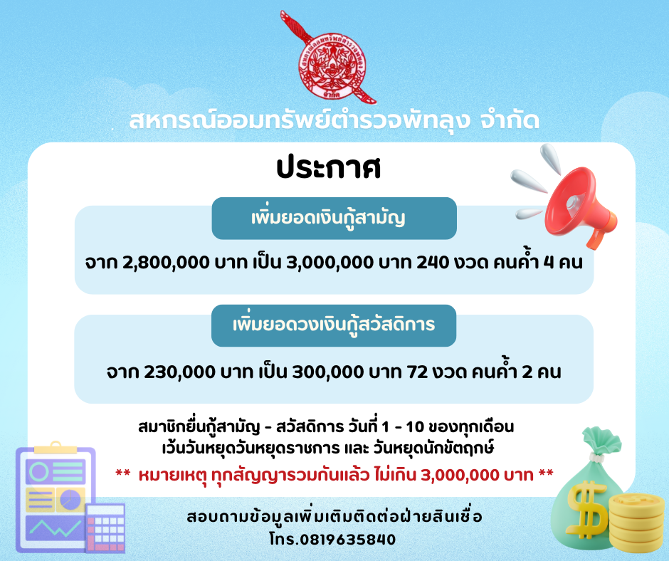 เพิ่มยอดวงเงินกู้สามัญเเละสวัสดิการ 30 พฤษภาคม 202530 พฤษภาคม 2025 @admin ข่าวประชาสัมพันธ์ เรื่อง เพิ่มยอดวงเงินกู้สามัญเเละสวัสดิการ @admin